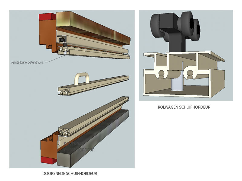 - Bij een standaard schuifhordeur beweegt het schuivende gedeelte zich voort door 2 rolwagens in een bovenrail, die ieder voorzien zijn van 4 kunststof wieltjes. Aan de onderzijde wordt er onderrail gemonteerd. Afhankelijk van uw situatie wordt een raamgeleider (h-profiel) of een vloergeleider (f-profiel) gebruikt, desgewenst in een afwijkende RAL-kleur.