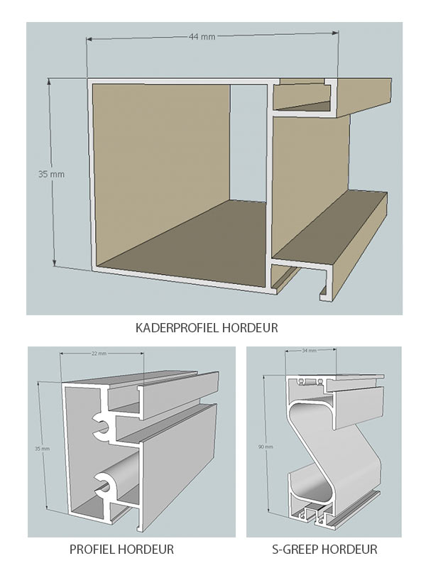 - Onze profielen zijn gemaakt van hoogwaardig aluminium en worden gepoedercoat in elke gewenste RAL-kleur. Een schuifvliegendeur wordt verstevigd met een horizontale profiel met kunststof handgreep of een zogenaamde S-greep (handgreep over de volle breedte van de deur, zowel aan de binnen- als buitenzijde te bedienen);